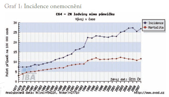 Česká republika se v incidenci zhoubných novotvarů již dlouho udržuje na předních místech v Evropě. Ovšem jen u dvou diagnóz dosahuje naprostého prvenství, a to u karcinomu kolorekta u mužů a karcinomu ledvin. Pokud však vítězíme u kolorektálního karcinomu o prsa, pak naše trpké vítězství v incidenci karcinomu ledviny je o několik koňských délek (graf 1).