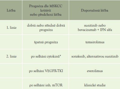Na základě výše uvedených údajů opírajících se o výsledky kontrolovaných, randomizovaných, prospektivních klinických studií, jež vedly k udělení registrace v příslušných indikacích, lze doporučit tento algoritmus léčby mRCC (tabulka 15)