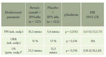 Studie Avoren jasně prokázala superioritu kombinace bevacizumab a IFN alfa oproti IFN alfa statisticky signifikantním prodloužením PFS, vyšším ORR a nesignifikantním trendem k prodloužení OS (HR= 0,91, p = 0,33).
