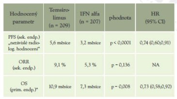 Temsirolimus 25 mg i.v. 1x týdně versustemsirolimus 15 mg i.v. 1x týdně + IFN-alfa 6 MIU s.c. 3x týdně versus IFN alfa (3 MIU, se zvýšením až na 18 MIU s.c. 3x týdně) (tabulka 6)