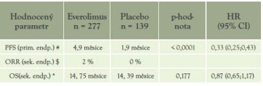 * zkresleno v důsledku cross-over designu povoleného při progresi v placebové větvi (umožněn přechod na everolimus)