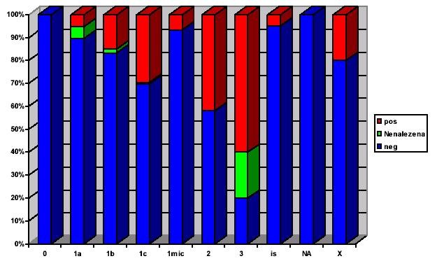 Celkově positivních nálezů bylo 184, tedy 27,5%. Následující graf znázorňuje rozložení positivních nálezů dle velikosti tumoru a dle grade.
