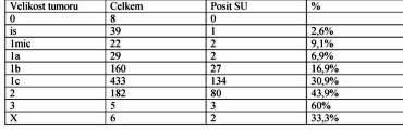 Sledována byla závislost pozitivity sentinelových uzlin na velikosti tumoru na grade.