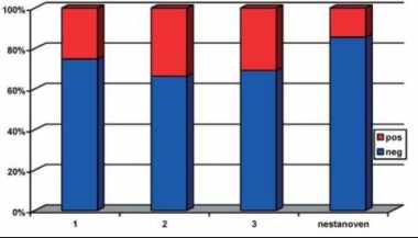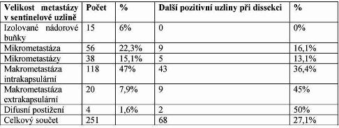 Pozitivní nálezy v sentinelových uzlinách bylo možno rozdělit dle velikosti postižení, sledován byl pak počet pozitivních uzlin v dissekátu axilly.
