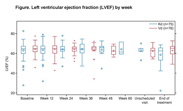 CEAC evaluation found 14 pts (Kd: 8; Vd: 6) had clinically meaningful changes in ECHOs while on study; 11/14 (79%) did not meet the ECHO criteria for decreased LVEF as defined earlier. The CEAC reported that more Kd vs Vd pts had evidence of HF (n=4 vs n=0) or pulmonary HTN (n=4 vs n=1).