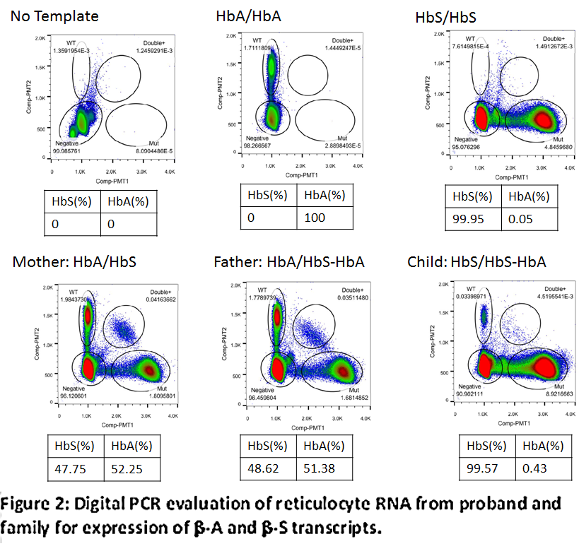 Analyses of parents’ blood samples and DNA revealed that each were carriers for sickle cell allele. Hemoglobin analysis showed the father expressed HbS fraction at 41.3% and the mother at 33.3%, while the proband had a majority of HbS, some HbF and no detectable HbA. The reduced HbS fraction in the mother could be explained by co-inheritance of α-thalassemia (αα/α-3.7). The proband did not inherit α-thalassemia from the mother.