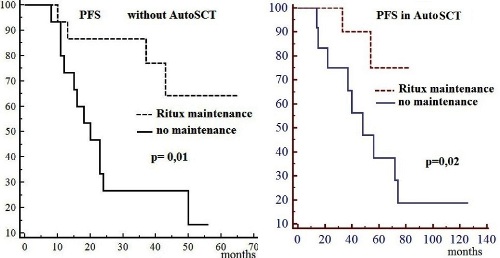 Results: In a group of non-intensified patients without Autologous SCT the probability of 2-years PFS and median PFS was 26% and 20 months if RM was not given (n=16) versus 86% and median PFS not yet reached at the median follow-up of 37 (14-65) months if RM (n=15) was administered (p=0,01). In Autologous SCT patients the probability of 2-years PFS and median PFS was 75% and 46 months if RM was not given (n=12) versus 95% and median PFS not yet reached at the median follow-up of 50 (22-82) months if RM (n=14) was administered (p=0,02). No statistically significant differences were observed when comparing age, gender, MCL stage, MIPI index, complete remission ratios prior to RM. RM administration was statistically significant predictor for prolonged PFS in the multivariable analysis.