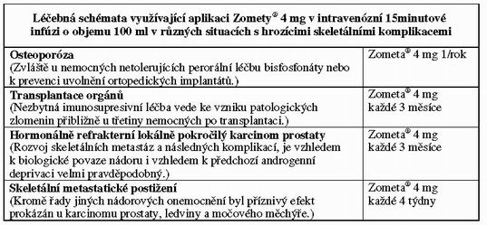 V minulosti doporučovaná léčba perorálními bisfosfonáty byla u nemocných s karcinomem prostaty často provázena významnými dyspeptickými obtížemi či intolerancí. Vzhledem k velmi špatnému vstřebávání z GIT (pouze kolem 2% účinné látky) byla rovněž efektivita této léčby menší. Přinos zoledronátu spatřujeme v jeho dobré toleranci a vysoké efektivitě, pro kterou se začal využívat nejen při metastatickém postižení skeletu, ale i v dalších indikacích, které shrnuje následují tabulka č. 4.