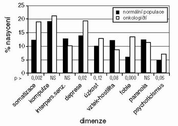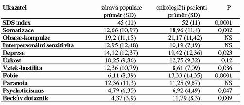 Průměrný věk probandů v souboru (55 roků ± 13) přibližně odpovídal kontrolní skupině vzorku zdravé populace (52 roků ± 1). Častěji byly zastoupeny ženy (20) než muži (10), zatímco ve studii DIR bylo zastoupení žen (182) a mužů (154) vyrovnanější. Tabulka 1 porovnává u obou souborů SDS indexy, celkové skóre Beckova dotazníku a procentuální nasycení dimenzí dotazníku SCL 90. Graf 1 ukazuje poměr sycení složek SCL 90 u onkologických a pacientů a normální populace.