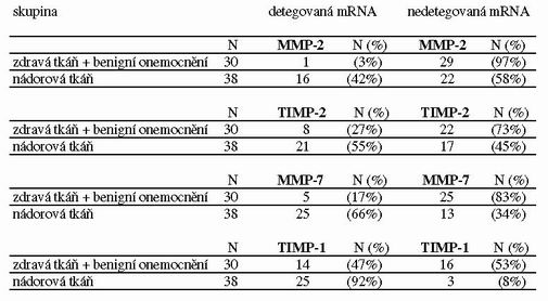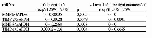 Relativní hladiny specifických mRNA kopií MMP-2, TIMP-2, MMP7 a TIMP1.