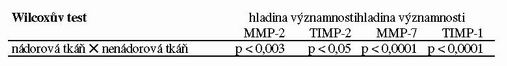 Hodnoty statistické významnosti (p-value) přítomnosti mRNA MMP-2, TIMP-2, MMP-7 a TIMP-1 u vzorků nádorové kolorektální tkáně a nenádorové kolorektální tkáně (zdravá tkáň + benigní onemocnění)