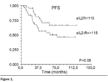 Background. Recent data show that host antitumor immunity is actively suppressed by cancer cells in many ways. The key mediator of immune tolerance is IL-2 stimulating differentiation of host CD4+ cells into suppressive CD4+CD25+ T-regulatory cells. Soluble IL-2 receptor is generated exclusively by the proteolytic cleavage of membrane IL-2R. Soluble complex IL2R-IL-2 leads to prolonged persistence of IL-2 signaling. Aims. To analyze the prognostic impact of pretreatment sIL-2R levels on FL patients’ survival in the rituximab era.Methods: We studied 88 patients with newly diagnosed FL (median age 57 years). The FLIPI risk groups were: high 43%, intermediate 27%, low 30%. Most patients (77%) had advanced-stage disease; bulk >7cm was present in 49%. Almost half of them had elevated B2M level (>3mg/L, 45%). The mean (median) sIL-2R level at diagnosis was 188.5 ±174.3 kU/L (132.6 kU/L); elevated sIL-2R ≥115 was detected in 48/88 patients (55%). The GELF criteria were met by 79 (90%) patients. Treatment was applied with respect to their disease: CHOP/CHOP-like regimen in low-intermediate-risk FL (n=40, 50%) and more intensive protocol (Promace-Cyta-BOM/adequate intensity protocol) in intermediate-risk patients with additional unfavorable risk factors (high B2M, s-TK or bulky; n=10, 13%). Nineteen (24%) patients were treated with upfront ASCT (conditioning BEAM 200) due to very high-risk disease. Rituximab was added to frontline therapy in 66% and maintenance immunotherapy with rituximab (or interferon) was applied in 31% (39%) of cases. Patients with high sIL-2R share more unfavorable prognostic features than low sIL-2R group: HFLIPI (60% vs 23%, p<0.001), bulky disease >7cm (70% vs 28%, p<0.001), advanced clinical stage (92% vs 60%, p<0.001), elevated B2M (60% vs 28%, p=0.002). No differences were observed between both groups in terms of age distribution, rituximab or maintenance application. Patients with high sIL2R needed more intensive therapy approaches: 25/29 (86%) patients treated with intensive protocol or ASCT were from high sIL2R group. By contrast, all 9 patients with no need for therapy had low sIL2R (p=0.01). Results. Complete remission rate was 83% and was comparable in both groups (81% vs 85%, p=0.67). After a median follow-up of 67 months (5.6 yrs), only 25/48 (52%) highsIL- 2R patients are alive in the 1st CR, compared to 29/40 (73%) in low sIL- 2R group. Five-year progression-free survival was 54% (95% CI 0.39-0.68) in high-sIL-2R group, compared to 66% (95%CI 0.49-0.83, p=0.05) in high-sIL 2R group. Overall survival was not significantly different between both groups (p=0.14) despite more than twice as many events observed in high-sIL-2R group (13 vs 5 deaths). Conclusions. Soluble IL-2R plays an important biological role in tumor immunosurveillance. This fact reflects the presence of advanced disease features such as bulky disease, high B2M and higher FLIPI scores. Despite application of more intensive treatment approaches, the outcome of patients with high sIL-2R is less favorable. This parameter should be considered an adverse negative prognostic factor.Supported by grants from Czech Ministry of Education (MSM 6198959205) and Faculty of Medicine and Dentistry, Palacky University Olomouc (LF-2011-006).