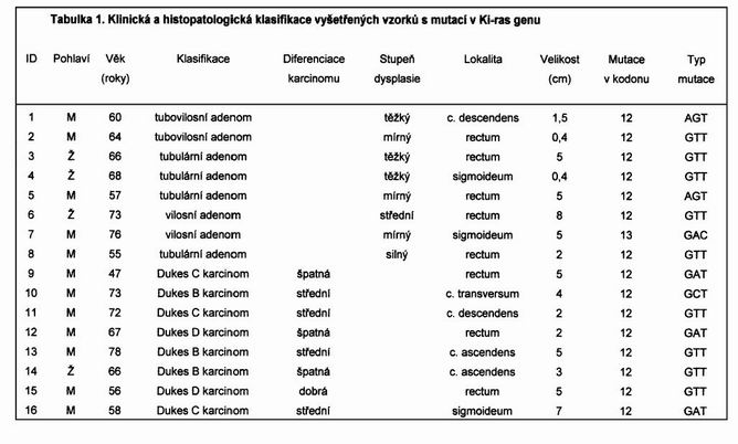 Ki-ras mutace byly nalezeny v 8 z 18 (44%) vyšetřovaných karcinomů a v 8 z 19 (42%) adenomatosních polypů. Mutace nebyly detekovány ani ve vzorcích hyperplastických polypů ani v normální střevní tkáni. Sekvenování ukázalo, že nejběžnější genetickou změnou, která zasahuje kodon 12 genu, je transverze GGT-GTT. Tento typ mutace byl identifikován v 50% karcinomů a 71% adenomů s prokázanou přítomností mutace. V kodonu 13 byla identifikována tranzice GGC-GAC pouze v jednom kolorektálním adenomu. Detailnější informace o mutacích, včetně klinické a histopatologické klasifikace positivně testovaných tumorů a polypů demonstruje Tabulka 1.