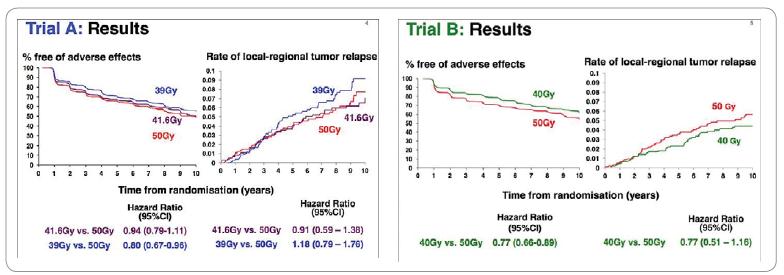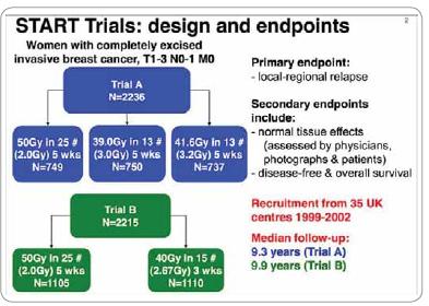 Předmětem zájmu je prokázání noninferiority hypofrakcionačních režimů, event. vytipovat skupinu žen s velmi nízkým rizikem vzniku LR, u kterých pooperační RT celého prsu nemá žádný přínos. Prezentovány budou dvě studie: trial START a trial TAR-GIT. Trial START srovnává hypofrakcionovanou a standardní 5týdenní RT v lokoregionální léčbě EBC v 10letém sledování. Dlouhá doba sledování potvrdila, že hypofrakcionační schéma je minimálně stejně efektivní jako 5týdenní schéma RT. Během 3 let bylo randomizováno 4 451 žen s kompletní excizí invazivního karcinomu prsu. Ve studii START A bylo srovnáváno podání 50 Gy podané ve 25 frakcích během 5 týdnů vs 41,6 Gy nebo 39 Gy v 13 frakcích během 5 týdnů.