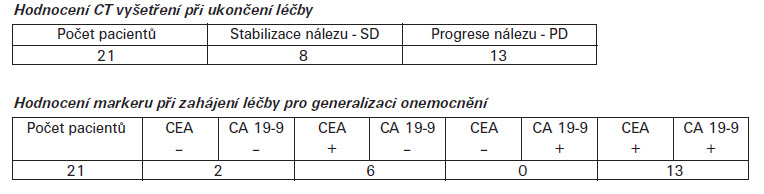 a) provedené CT vyšetření po léčbě u všech pacientů potvrdilo přetrvávání nemoci, a to 8x SD a 13x PD,