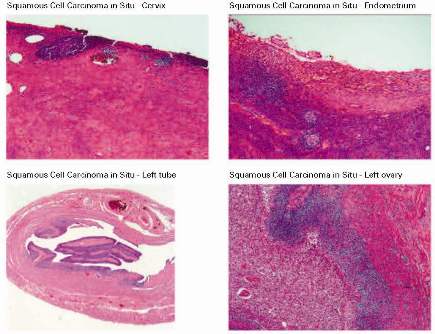 We report a case of a 66-year-old woman, who was found to have malignant squamous cells on a cervical smear. The patient underwent a cervical biopsy followed by a cone biopsy with D&C with histologically confirmed squamous cell carcinoma in situ spreading to the endocervical margin of the cervical cone and to the endometrium. Laparoscopically-assisted vaginal hysterectomy with bilateral salpingo-oophorectomy was indicated. No grossly visible tumor was present in the uterus, both ovaries, and tubes. The microscopic examination revealed squamous cell carcinoma of the uterine cervix in situ with a contiguous intraepithelial spread to the endometrium, tubes, and ovaries, with a focal invasion to the parenchyma of both ovaries.