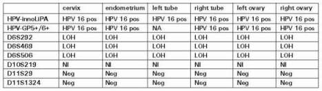 PCR analysis for high-risk human papillomavirus (HR-HPV) infection revealed HPV 16 positivity all in cervix, endometrium, fallopian tubes, and ovaries. Loss of heterozygosity (LOH) analysis with a panel of microsatellite markers detected a homogeneous LOH pattern on 6p and 6q throughout all microdissected lesions.