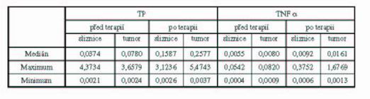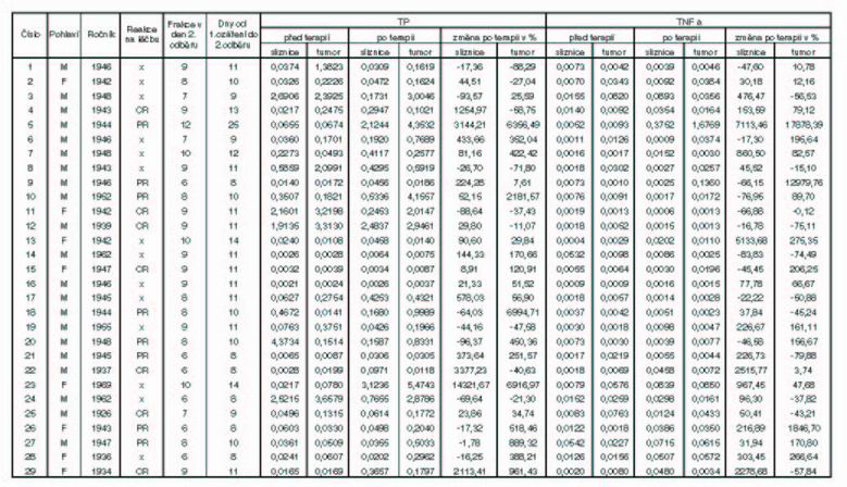 Do souboru bylo zařazeno 29 pacientů v pokročilém stádiu rektálního karcinomu, léčených konkomitantní radioterapií (celková dávka 50,4 Gy, frakcionace po 1,8 Gy denně) a chemoterapií Xelodou (dávka 825 mg/m2 denně, rozdělená do dvou dávek). Od každého pacienta byly získány vzorky nádorové tkáně a zdravé sliznice tlustého střeva před zahájením terapie a v období 2 týdnů po zahájení terapie (rozmezí bylo 8 – 14 dní, vzorky od jednoho pacienta byly odebrány až po 25 dnech, důvodem dlouhé prodlevy bylo přerušení radioterapie v období vánoc). Po izolaci RNA a reverzní transkripci byly metodou kvantitativní real-time PCR stanoveny hladiny mRNA tymidin fosforylázy (TP) a tumor nekrotizujícího faktoru α (TNF α). U všech vzorků byla stanovena i hladina referenčního housekeepingového genu pro glyceraldehyd-3-fosfát-dehydrogenázu (GAPDH), výsledky pak představují poměr mezi počtem kopií sledovaného genu (TP nebo TNF α) a referenčního GAPDH.