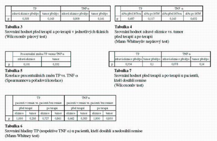 Pomocí Mann-Whitneyova testu bylo zjištěno, že exprese TP se statisticky významně nelišila v nádorové tkáni a ve zdravé sliznici před zahájením léčby (p=0,4869) ani po zahájení terapie (p=0,1168). U TNF α byla situace obdobná (p=0,1447 před léčbou a p=0,6322 po zahájení léčby) (tab. 4). Mediány u TP byly ale vyšší v nádorové tkáni (0,0780) ve srovnání se zdravou sliznicí (0,0374) před zahájením terapie, i po zahájení radioterapie (0,1587 v sliznici a 0,2577 v nádorové tkáni). U TNF α tomu bylo také tak (tab. 2).