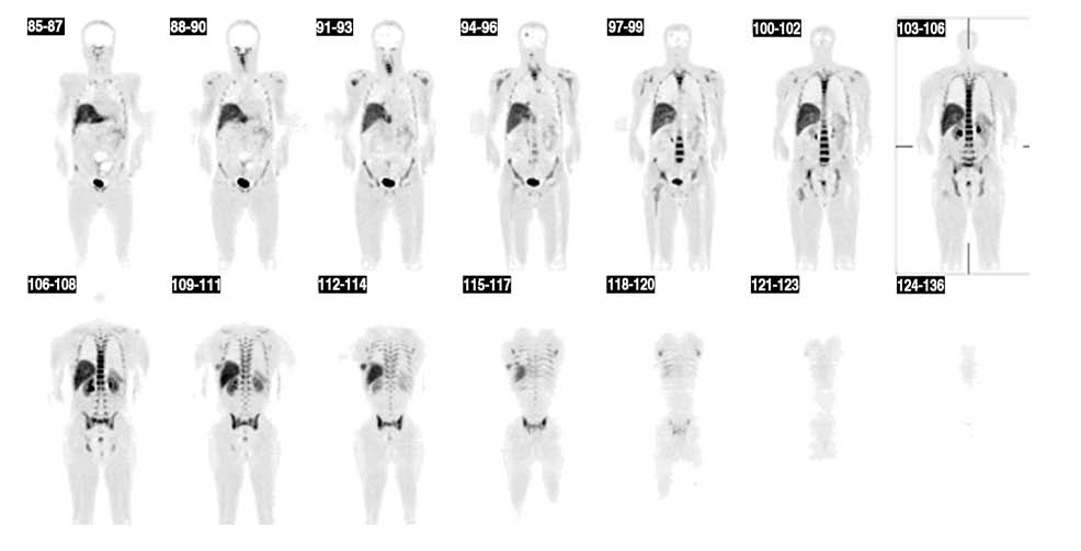 Celotělový FLT - PET scan se zřetelným ložiskem zvýšené akumulace radiofarmaka v mozku. Další patologická ložiska v oblasti plic, mediastina a hrudní stěny vpravo laterálně.