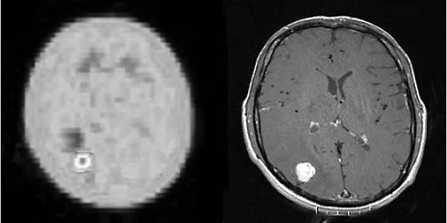 FLT - PET (obrázek vlevo) scan mozku s ložiskem zvýšené akumulace