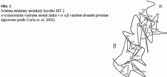Metalothioneiny (MT) patří do skupiny intracelulárních na cystein bohatých proteinů o molekulové hmotnosti od 6 do 10 kDa. Díky své vysoké afinitě k zinku, mědi nebo kadmiu, je jejich hlavní funkcí homeostatická kontrola a detoxikace iontů těžkých kovů na buněčné úrovni. MT jsou rozděleny do tříd MT-I a MT-II s ohledem na jejich primární strukturu a organismus, ze kterého byly izolovány. Třída MT-I zahrnuje savčí metalothioneiny tvořené 61-68 aminokyselinami. V těchto proteinech nejsou přítomny aromatické aminokyseliny a 20 cysteinů se v primární sekvenci vyskytuje nejčastěji v těchto repeticích: Cys-X-Cys, Cys-Cys-X-Cys-Cys, Cys-X-Cys-Cys (X: jiná aminokyselina než abcystein). MT se skládají ze dvou vazebných domén (α, β), které jsou složeny z cysteinových molekul přičemž kovalentní vazby atomů kovů se účastní sulfhydrylové (SH) zbytky. N-terminální bčást peptidu je označena jako β-doména a má tři vazebná místa. V případě α-domény (C-terminální části) byla potvrzena schopnost vyvázat čtyři ionty kovů (obr.1) (Kägi and Kojima, 1987).
