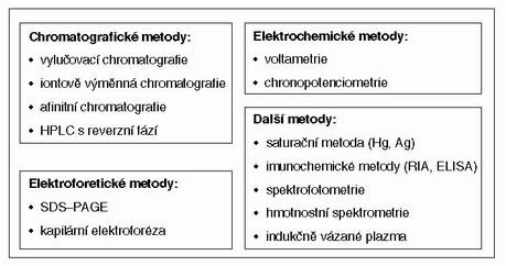 Ke stanovení MT je využíváno široké spektrum metod chemické analýzy (Dabrio et. al. 2002), viz. obr. 2. K separaci MT se nejčastěji využívají chromatografické metody, které lze rozdělit na dvě skupiny. Jednak jde o metody využívající separace za vyššího tlaku (HPLC). Jako stacionární fáze se zde často využívá reverzních fází s chemicky vázaným oktylem nebo oktadecylem v kombinaci s polární mobilní fází. Pro detekci se obvykle využívá UV-Vis detektor diodového pole. Druhou skupinu představuje metoda nízkotlaké chromatografie: FPLC (vylučovací chromatografie), kde separace probíhá na základě rozdílné molekulové hmotnosti látek obsažených ve vzorku. Kromě nejběžněji používané UV-Vis detekce lze úspěšně stanovit nízké koncentrace MT elektrochemickými metodami. Elektrochemické metody jako je voltametrie zapojená v diferenčním pulzním módu (DPV) nebo derivativní chronopotenciometrie s konstantním proudem (CPSA) umožň ují stanovení nanomolárních koncentrací MT. Tyto analytické postupy vycházejí z elektrodových reakcí, které jsou provázeny vylučováním vodíku ze složek základního elektrolytu. CPSA v kombinací s technikou adsorptivního přenosu (AdTS) umožň uje stanovovat koncentrace MT na úrovni femtomolů ve velmi malých mobjemech (jednotky µl) vzorku.