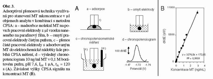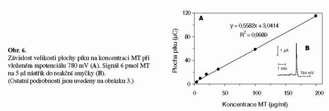 Elektroanalytické stanovení studovaného analytu má řadu výhod, mezi které zcela jistě patří rychlost, velmi dobrá citlivost, reprodukovatelnost a finanční nenáročnost metody. V našich dřívějších experimentech jsme se zabývali stanovením MT pomocí elektrochemické metody CPSA ve spojení s adsorptivní přenosovou technikou (AdTS) (Kizek et. al. 2001; Strouhal et. al. 2003; Trnkova et. al. 2002). MT byl nejdříve akumulován na pracovní povrch rtuťové elektrody, interferující látky odmyty roztokem pufru a elektroda s adsorbovaným MT je přenesena do základního elektrolytu kde probíhá samotné stanovení (Obr. 3A). Při měření 10 ng MT/ml poskytuje metoda AdTS CPSA velmi dobře vyvinutý a symetrický katalytický signál (Obr. 3A-d). Jak je patrno na obrázku 3B je závislost koncentrace MT na výšce signálu lineární (y = 3276,5x + 172,65; R2 = 0,9939). Cílem této práce bylo stanovení MT v průtokovém systému ve spojení s elektrochemickým detektorem (FIA-ED). Multi-elektrodový elektrochemický detektor obsahuje osm porézních grafitových elektrod zapojených v tandemovém uspořádání a na každou z těchto elektrod je možné vložit konstantní potenciál. V tomto zapojení bylo možné studovat oxidační signály MT. Je známo, že na uhlíkových elektrodách proteiny poskytují oxidační signály. (Dabrio et. al. 2002)