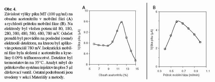 Pomocí FIA-ED bylo provedeno základní studium chování králičího MT-1a na uhlíkových porézních elektrodách elektrochemického detektoru. Protože klasické elektrochemické stanovení vyžaduje přítomnost elektrolytu (Březina and Zuman 1952), testovali jsme vliv poměru acetonitrilu a 0,09% kyseliny trifluorooctové na elektrochemickou odpověď analytu. ACN a TFA jsou často používanou součástí mobilní fáze při HPLC separaci, proto je vhodné testovat jejich vliv na elektrodové děje probíhající na elektrodovém systému detektoru. Získaná závislost poměru acetonitrilu a 0,09% TFA ve FIA mobilní fázi ukazuje maximální odpověď na detektoru při obsahu 11-12% ACN. Negativní vliv vyšší koncentrace acetonitrilu na studovaný signál může být způsoben změnou struktury MT a případným zhoršením elektrochemického chování studované látky (Obr. 4A). Důležitým parametrem pro získání maximální odezvy na elektrochemickém detektoru je celkový průtok mobilní fáze. Testovali jsme průtok mobilní fáze od 0,3 do 1 ml. Maximální odezvy jsme získali při průtoku 0,6 ml/min. Při vyšším průtoku se již proudová odezva snižuje a to pravděpodobně díky omezenému času prekoncentrace molekul MT na povrchu pracovních elektrod. Naproti tomu proudové odezvy zaznamenané v oblasti 0,6 ml/min rychlosti průtoku pravděpodobně souvisí s možností saturace aktivního povrchu elektrody čímž dochází ke zvýšení sledovaného signálu (obr. 4B).