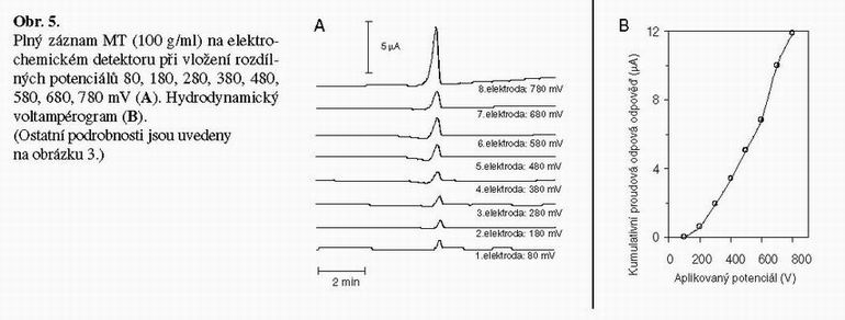 Byl studován vliv aplikovaného potenciálu na pracovní elektrody při již známém průtoku mobilní fáze 0,6 ml/min, vhodném poměru mobilní fáze (12% ACN a 88% 0,09% TFA) a teplotě detektoru 35°C. Pro nalezení vhodného potenciálu oxidace stanovovaného MT byl na grafitové porézní elektrody detektoru vkládán potenciál 80, 180, 280, 380, 480, 580, 680 a 780 mV. Získané elektrochemické signály 100 ng MT/ml na jednotlivých elektrodách detektoru jsou ukázány na obrázku 5A. Z uvedených signálů byla odečtena proudová maxima z nichž byl sestrojen hydrodynamický voltampérogram, který vypovídá o elektrochemickém chování stanovované látky v průtokovém uspořádání (Obr. 5B). Pro měření jednotlivých vzorků se volí potenciál v místě největšího proudového rozdílu a nejmenšího potenciálového rozdílu hydrodynamického voltampérogramu. V našem případě bylo vybráno 780 mV jako nejvhodnější potenciál, který byl vložen na poslední elektrodu detektoru.