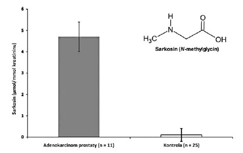 Po optimalizaci a validaci ionexové chromatografie bylo testováno použití této metody pro stanovení sarkosinu v biologických vzorcích. Výsledky stanovení sarkosinu v moči pacientů (n = 11) a zdravých dobrovolníků (n = 25) jsou ukázány na grafu v obr. 1. Z grafu je patrné, že zatímco v moči dobrovolníků byl průměrný obsah sarkosinu 0.1 ± 0,3 µmol sarkosinu/mmol kreatininu, u pacientů s CaP byl průměrný obsah sarkosinu 4.7 ± 0.7 µmol sarkosinu/mmol kreatininu. Tyto výsledky naznačují, že sarkosin je potenciálně vhodný marker pro diagnostiku karcinomu prostaty.