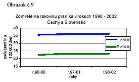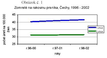Hodnotili sme mortalitu na rakovinu prsníka (C50) v Čechách a na Slovensku v v rokoch 1996 až 2002 podľa databáz štátnych štatistických úradov.