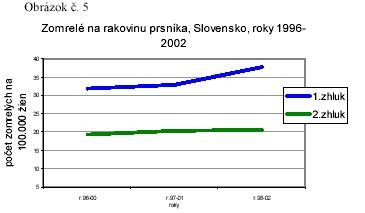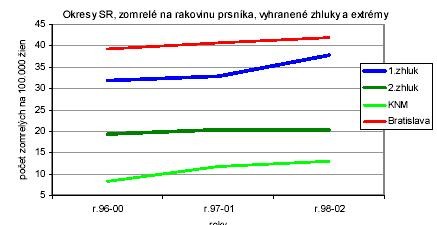 Na Slovensku, pokiaľ ho hodnotíme rovnakou metódou, ale v samostatnom výpočte, kde sú použité iba slovenské dáta, je vyšší rozdiel medzi „dobrým“ a „zlým“ zhlukom. Oba zhluky, na rozdiel od Čiech, majú narastajúcu tendenciu, vo všetkých okresoch, na celom území pribúda relatívna úmrtnosť na rakovinu prsníka rýchlejšie, ako v Čechách. Ak je pravdivá teória o neblahom vplyve zlepšujúcich sa životných podmienok, tak je táto správa pre Slovákov paradoxne potešiteľná.