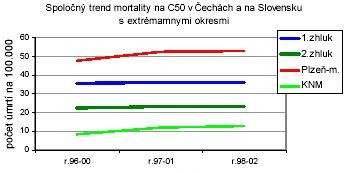 Čechy majú trendy okolo 31 resp. okolo 42 úmrtí na 100.000 žien, s extrémnym okresom Plzeň – mesto, ktorý má hodnotu cca 52 úmrtí.