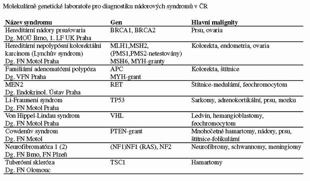 Síť genetických ambulancí je rozprostřena po celé ČR. Síť molekulárně genetických laboratoří, které vyšetřují hereditární nádorové syndromy, je utvořena především v Praze, Brně, Olomouci, Plzni, nicméně se předpokládá, že se požadavky na tato vyšetření budou stupň ovat a další molekulárně genetické laboratoře se tímto testováním začnou zabývat. Akreditace pracovišť a kontroly kvality by měly být zárukou spolehlivosti pracoviště.