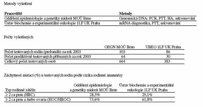Testování predispozičních genů BRCA1 a BRCA2 pro hereditární formu nádorů prsu/ovaria probíhá v ČR na dvou pracovištích, která obě podstupují každoročně mezinárodní kontrolu kvality organizovanou v rámci EMQN (European Molecular genetics Quality Network).
