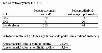bylo zachyceno nosičství mutace u 24 příbuzných, vyloučeno u 53 příbuzných.
