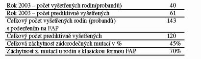 Familiární adenomatosní polyposa (APC gen) je testována v Ústavu biologie a lékařské genetiky 1 LF UK a VFN. Metody: genomická DNA, PCR, DGGE, PTT, sekvenování