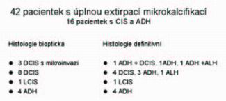 Ve skupině 65 žen s vakuovou mamotomií rozsáhlejších shluků mikrokalcifikací byl u 3 žen prokázaný DIC (duktální invazívní karcinom), u 1 ženy LIC (lobulární invazívní karcinom), u 6 žen DIC spolu s DCIS, u 7 žen DCIS s mikroinvazí a u 15 DCIS bez mikroinvaze a u 4 žen ADH. Histologie bioptická a otevřená se u žen s IC (invazívním karcinomem) shodovala. Ze 7 DCIS s mikroinvazí z vakuové biopsie byl u 3 žen v definitivní histologii prokázaný IC.