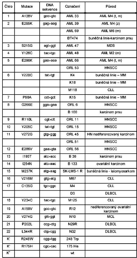 Pomocí metody FASAY jsme analyzovali status proteinu p53 u různých typů nádorů. Identifikovali jsme 22 různých teplotně závislých mutací, kde většina z nich (91%) spadá do DNA vazebné domény proteinu p53 (Tabulka 1). U těchto 22 teplotně závislých p53 mutantů jsme dále analyzovali jejich funkční a strukturní vlastnosti: studovali jsme transaktivační schopnosti jednotlivých mutantů p53 ve vztahu k teplotě kultivace a k sekvenci různých responzivních elementů (p21, bax a RGC) a pomocí imunoprecipitace s konformačně specifickými protilátkami jsme analyzovali konformační vlastnosti těchto mutantů při různých teplotách.