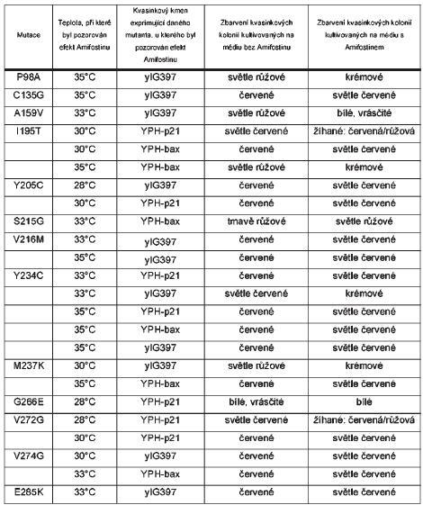 Kvasinkového expresního systému jsme dále využili při studiu efektu Amifostinu na transkripční aktivitu p53 mutantů. Amifostin (S-2[3-aminopropylamino-] ethyl phosphorothioic acid, WR2721, Ethyol) je radioa chemoprotektivní látka, která je klinicky využívána při snižování vedlejších efektů různých druhů nádorových terapeutik. In vivo je WR2721 konvertována na aktivní defosforylovanu formu WR1065 pomocí alkalické fosfatázy. WR1065 chrání nenádorovou tkáň před poškozením DNA tím, že vychytává volné kyslíkové radikály a neutralizuje účinek aktivních derivátů antineoplastických látek. Molekulární mechanismus, jakým Amifostin selektivně chrání nenádorovou tkáň, je zatím neznámá, ale předpokládá se, že nenádorová tkáň vzhledem k vyššímu obsahu alkalické fosfatázy může efektivněji přeměnit WR2721 na jeho aktivní formu než většina typů nádorové tkáně, která obsahuje nižší hladiny alkalické fosfatázy (Pluquet et al. 2003). Bylo prokázáno, že Amifostin indukuje DNA vazebnou aktivitu standardního typu proteinu p53 a zcela nebo částečně obnovuje transaktivační schopnosti některých teplotně senzitivních mutantů exprimovaných za nepermisivních podmínek, což je také jednou z příčin jeho protektivních účinků (Maurici et al. 2001). Efekt Amifostinu jsme analyzovali u všech 22 teplotně závislých p53 mutantů exprimovaných ve třech různých kvasinkových kmenech (s responzivními elementy p21, bax a RGC) při teplotách 25°C, 28°C, 30°C, 33°C a 35°C. Kvasinky rostly paralelně na médiu s Amifostinem a bez Amifostinu a jeho účinek se projevil ve změně zbarvení kvasinkových kolonií. Tato změna byla nejlépe pozorována při kultivační teplotě 33°C, kde kvasinkové kolonie rostoucí bez Amifostinu vykazovaly červený fenotyp a kolonie rostoucí na médiu s Amifostinem růžový nebo bílý, což naznačovalo reaktivaci proteinu p53. Tento efekt byl pozorován pouze u některých mutantů p53 (E285K, S215G, P98A, G266E, Y205C, V272G, I195T, M237K, C135G, V216M, Y234C, A159V, V274G) a tito p53 mutanti se navíc lišili v odpovědi na účinek působení Amifostinu vzhledem k různým promotorům (p21, bax, RGC). Celkově největší efekt reaktivace po působení Amifostinu byl pozorován u mutantů p53 exprimovaných v kvasinkovém kmeni s responzivním elementem RGC (Tabulka 2).