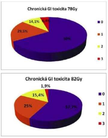 Medián sledování chronické toxicity činí 28,8 měs.pro celou skupinu pacientů, 30 měsíců pro rameno 78 Gy a 24 měsíců pro rameno 82 Gy. Chronická toxicita čtvrtého stupně nebyla pozorována u žádného pacienta. GIT toxicita G3 byla sledována u 6,4% pacientů v rameni 78 Gy a v 1,9% v rameni 82 Gy. GU toxicita G3 byla přítomna u 5,2% pacientů v rameni 78 Gy a v 5,7% pacientů v rameni 82 Gy.