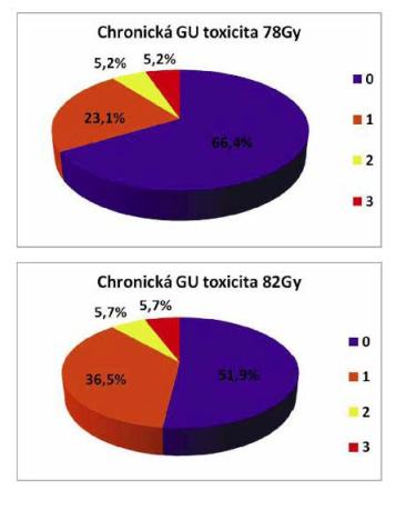 Akutní GIT toxicita G3-4 se nevyskytla u žádného pacienta. Akutní urologickou toxicitu G3-4 jsme pozorovali u 13% pacientů léčených dávkou 78 Gy a 10% pacientů léčených dávkou 82 Gy. Všechny případy urologické toxicity 4.stupně byly tvořeny pacienty s nutností zavedení PMK, nebyla pozorována nekróza či ulcerace močového měchýře. Pouze u jednoho pacienta (v rameni 78 Gy) byla zastižena významnější hematurie (při současně prokázané infekci močových cest). Pozorovaná akutní toxicita je srovnatelná s nežádoucími účinky u pacientů léčenými v minulosti 3D-CRT při použití dávky LD 74 Gy a 2 Gy v 37 frakcích. U těchto pacientů se rovněž nevyskytla žádná akutní GIT toxicita G3-4 a těžká urologická toxicita byla pozorována u 12,8% pacientů.