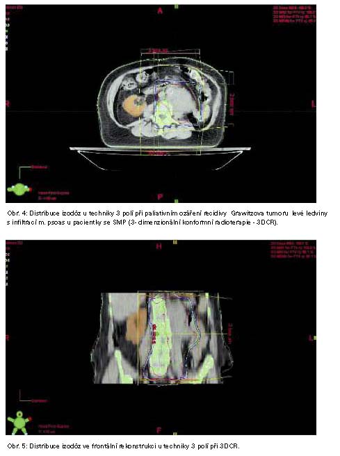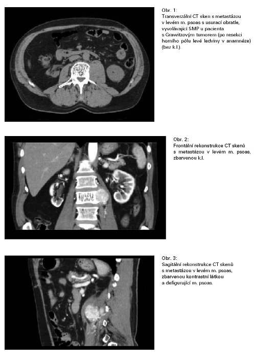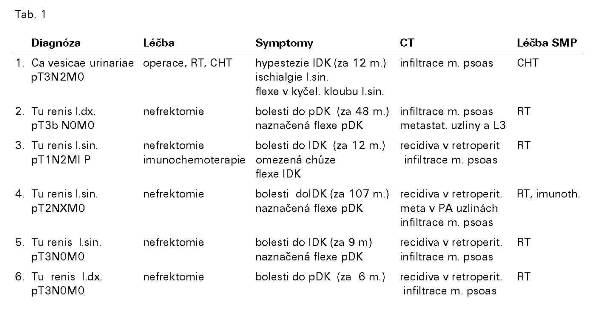 Nejvíce pacientů se SMP bylo nalezeno u maligních nádorů ledviny - 5, tj. v 1,6% (5/312), primární léčba byla vždy chirurgická - nefrektomie, v případě rozsahu T3 byli pacienti do r. 1998 ozářeni na oblast lůžka ledviny a paraaortálních uzlin, v dalších letech pacienti obdrželi imunoterapii nebo chemoimunoterapii. U pacientů se SMP radioterapie v primární léčbě nebyla. Infiltrace psoatu souvisela ve 4 případech (4/5) s recidivou v oblasti lůžka odoperované ledviny a/nebo metastatickým procesem paraaortálních uzlin, u 1 pacienta s metastázou v m. psoas (obr. 1., 2., 3.)