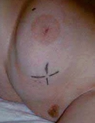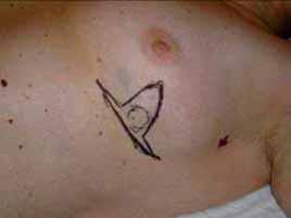 Obr. 1: Označení fixem na kůži pod USG![]() |