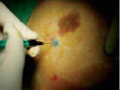 | Velmi elegantní metodou značení je značení pomocí suspenze aktivního uhlí, případně tetovací barvou. Výhodou tohoto značení je kromě poměrné jednoduchosti i to, že značka je trvanlivá, a mezi samotným označením a operací může tedy uplynout poměrně dlouhá doba. Toto lze s výhodou použít i při označení lokalizace a velikosti tumoru před neoadjuvantní chemoterapií. Pro zajištění správné funkce toto značení však vyžaduje, kromě samotného označení léze, i označení punkčního kanálku, který lze použít jako vodítko k samotné lézi. | Obr. 2: Označení vodicím drátkem![]() |