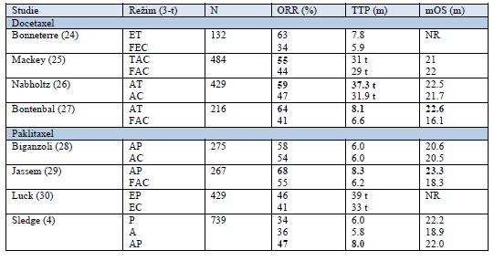 Tab. 3: Kombinace taxanŧ s antracykliny v první linií metastatického karcinomu prsu.