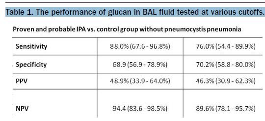 Background. Invasive pulmonary aspergillosis (IPA) is a severe infectious complication of hematological patients and its early diagnosis can contribute to the improvement of survival of affected patients. Aims. To evaluate the contribution of 1,3-β-D-glucan (BG) performed from bronchoalveolar lavage (BAL) fluid to IPA diagnosis. Methods. A retrospective analysis of BG detection in BAL fluid performed in 163 hematological patients between 1/2007 and 12/2011. Proven IPA (EORTC/MSG 2008 criteria) was documented in 2.6% (5 pts.), probable IPA in 10.7% (20 pts.) and possible IPA in 40.0% (75 pts). 46.7% (87 pts.) without evidence of IPA were considered as negative control. Pneumocystis pneumonia was diagnosed in 7.0% (13 cases) and positive culture from BAL fluid for Candida sp. was in 4.8 % (9 cases). Oral cavity colonization with Candida sp. was detected in 33.7% (63 cases). Results. 187 samples were included in the analysis. 48% (12/25 pts) of samples from proven/probable IPA pts were positive (> 80 pg/ml) and 12% (3/25) were intermediate (60-80 pg/ml). 37% (32/87) samples from pts without IPA were positive and 2% (2/87) were intermediate. After the exclusion of samples with pneumocystis pneumonia, the number of positive and intermediate results decreased to 32%.The mean BAL BG for patients with proven and probable IPA was 79 pg/ml (range 0-1145), for possible IPA 13 pg/ml (range 0-534) and for negative control 55 pg/ml (range 0-1477).The frequency of false positive results (>80 pg/ml) in our study was 29%. There was no difference between the mean BAL BG in the control group with or without oral cavity colonization with Candida sp. (43 vs. 32 pg/ml respective).The performance of glucan in BAL fluid tested at various cutoffs is presented in the table. Summary and Conclusions. The performance of glucan in BAL fluid has acceptable sensitivity, but a low specificity and positive predictive value for the diagnosis of invasive pulmonary aspergillosis. Moreover, due to “panfungality”of the assay it is necessary to use a combination of methods (ie galactomannan or PCR) for the confirmation of IPA.Supported by Masaryk University MUNI/A/0784/2011.