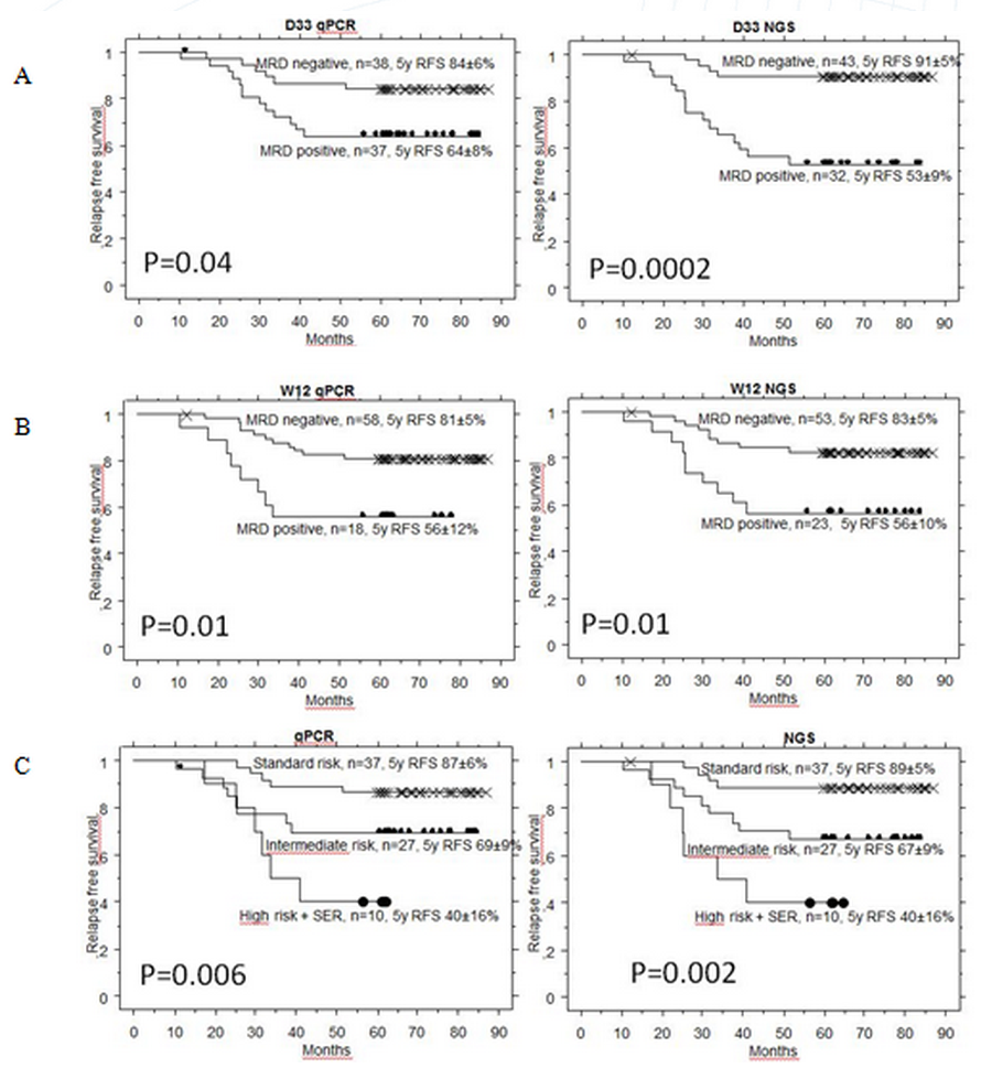 NGS approach detected significantly higher MRD than qPCR at day 33 in patients who later relapsed (p=0.001). NGS-MRD positivity at day 33 seems to provide a more accurate prediction of relapse than qPCR-MRD positivity (Fig. 1A). At day 78, the predictive value of NGS was comparable to qPCR (Fig. 1B). Combined day 33 and 78 MRD used for defining of SR, IR and HR (+SER) groups on BFM trials gave again similar results as qPCR (Fig. 1C). Similarly to FC, low NGS MRD defined a group with excellent prognosis at day 15.
