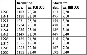 Tab.1 Incidence a mortalita pro diagnosu C53 v letech 1990 až 1999 v ČR.